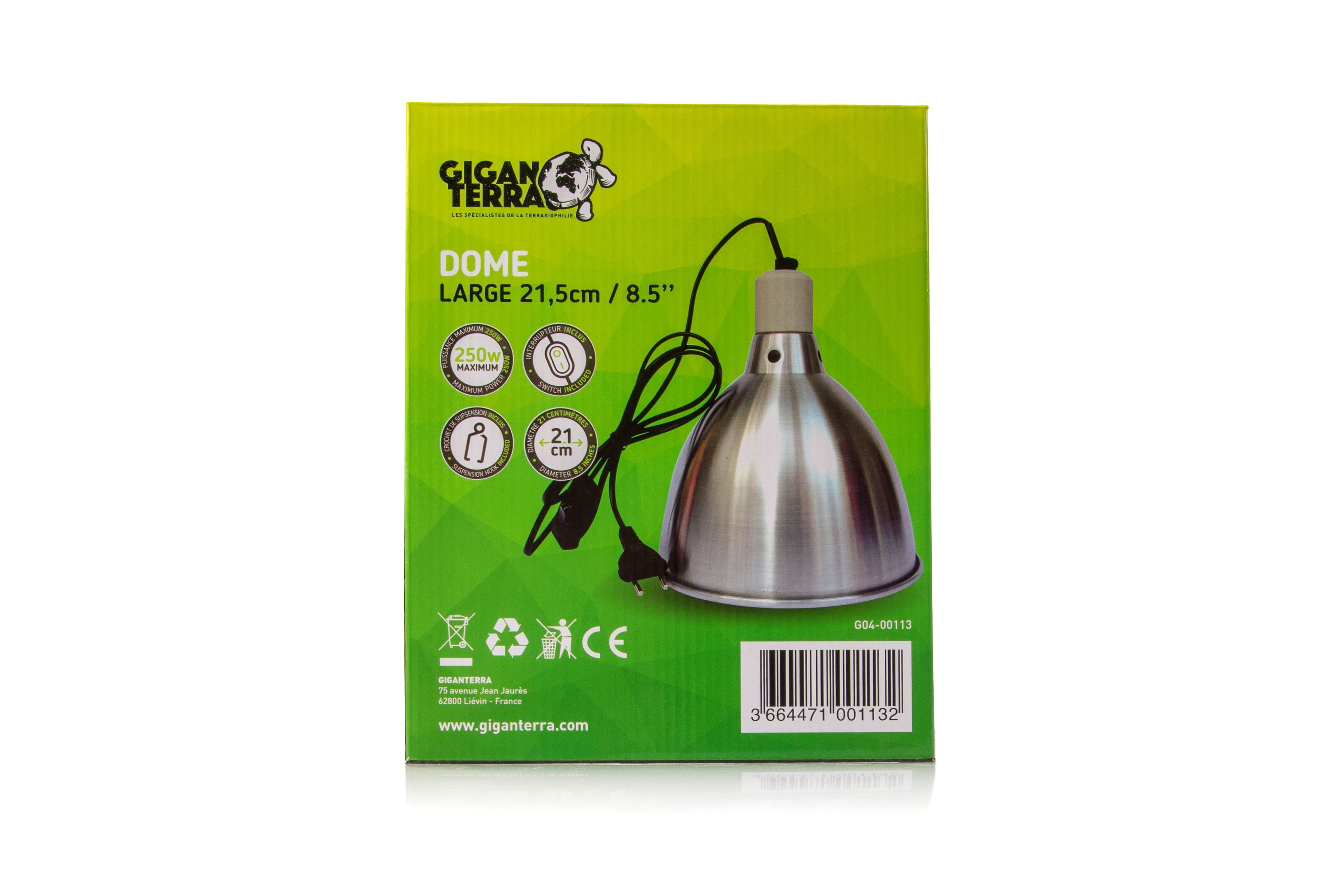 Le Dome Large 21.5 cm GiganTerra assure une diffusion ciblée de la chaleur et des UV, indispensable à l’équilibre thermique du terrarium. Grâce à son intérieur en aluminium poli, il concentre efficacement l’énergie lumineuse, créant un point chaud stable pour favoriser la digestion, l’activité et le confort des reptiles. Sa douille en céramique supporte des ampoules jusqu’à 250 W, offrant sécurité et durabilité. Facile à suspendre, muni d’un interrupteur et d’un câble robuste, ce dôme s’intègre parfaitement dans une installation soignée, au service du bien-être animal.
