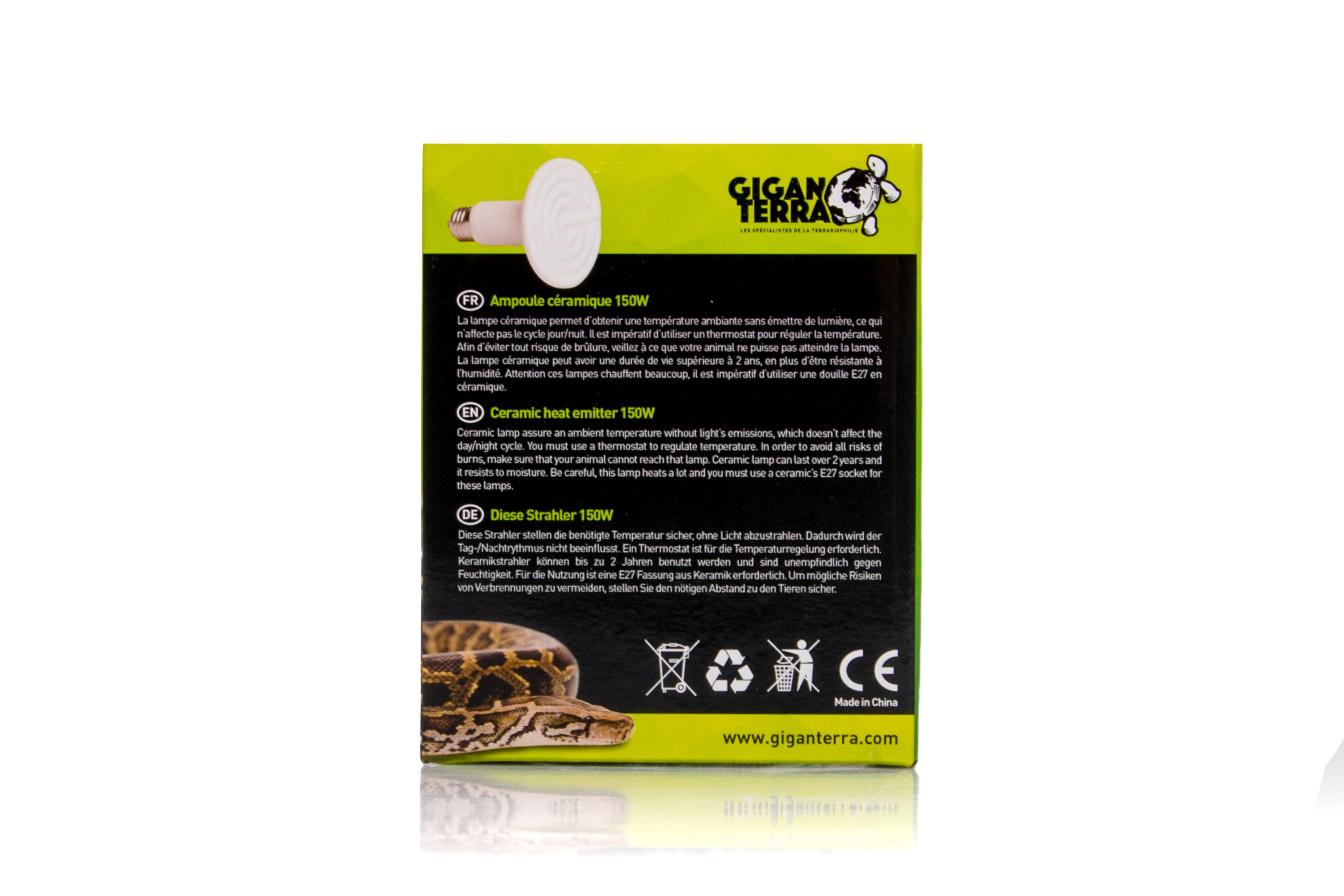 La Ceramiq Lamp 150 W GiganTerra a été pensée pour les habitats qui nécessitent un niveau de chaleur élevé, stable et réparti sur de grandes surfaces. Grâce à sa puissance thermique renforcée, elle s’adresse aux reptiles vivant dans des terrariums spacieux, profonds ou peu isolés, pour qui un apport thermique important est vital, notamment pendant la nuit ou les périodes fraîches.