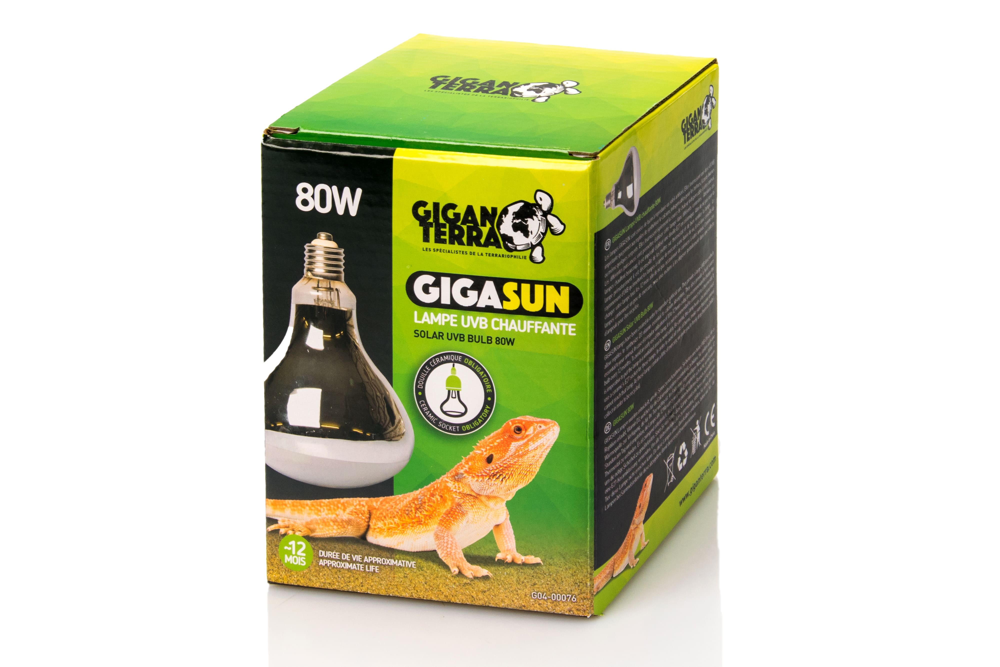 La GigaSun 80 W GiganTerra offre à votre reptile une exposition combinée à la lumière, à la chaleur et aux UVB, recréant l'effet stimulant d’un véritable soleil. Elle favorise la synthèse de la vitamine D3, essentielle à l’absorption du calcium, tout en générant un point chaud adapté aux espèces diurnes comme les tortues, lézards ou serpents. Son intensité thermique nécessite une douille E27 en céramique. Pour maintenir un bon niveau d’UVB, il est recommandé de la remplacer tous les 12 mois, même si la lampe reste fonctionnelle.