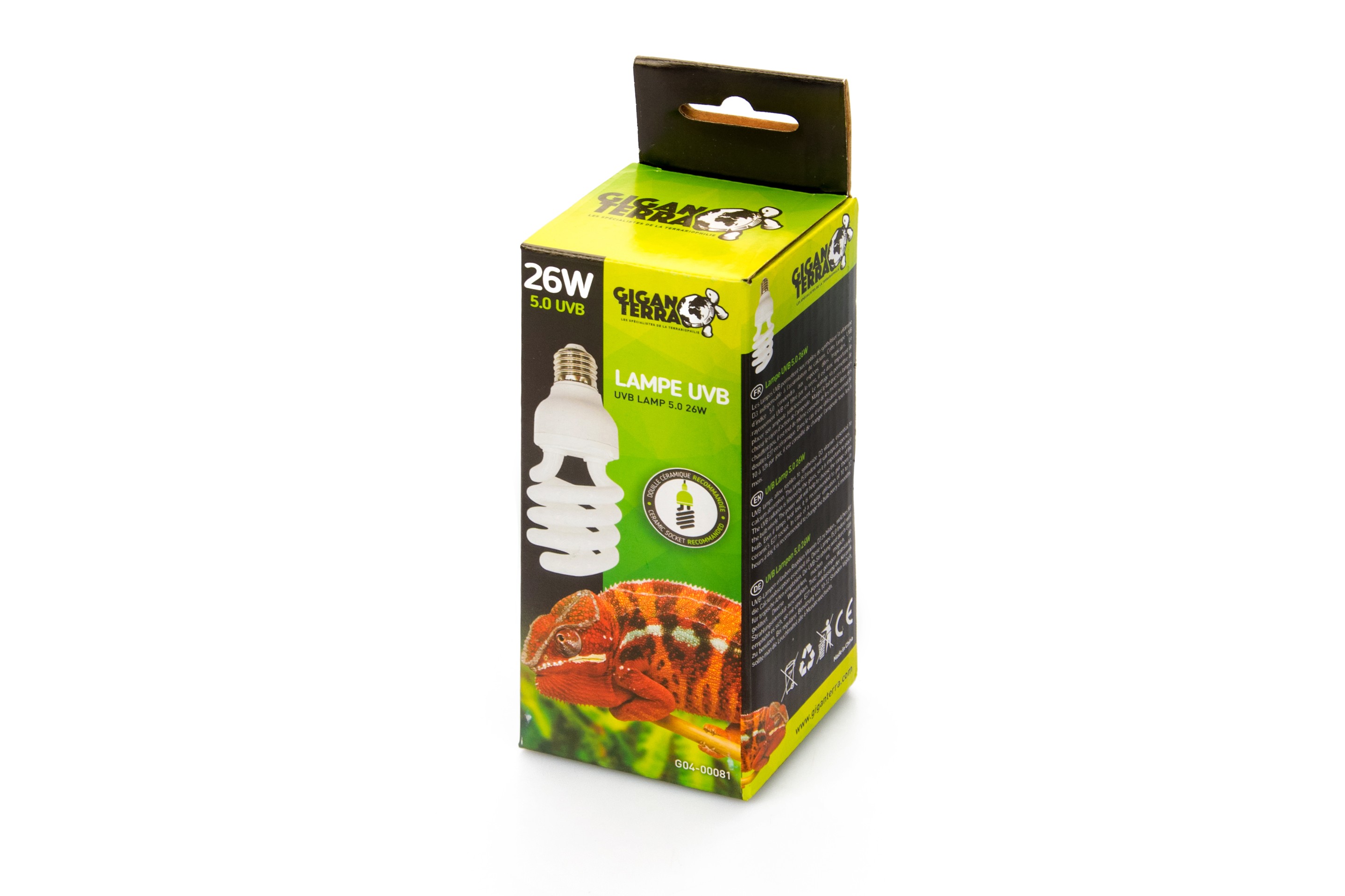 La Lampe UVB GiganTerra 26W 5.0 offre une couverture lumineuse idéale pour les reptiles tropicaux vivant sous une lumière filtrée par la végétation. Son rayonnement UVB favorise la synthèse de vitamine D3, essentielle à l’absorption du calcium et à la santé osseuse. Sa puissance de 26 watts permet une portée élargie, adaptée aux terrariums de taille moyenne à grande. Pour garantir son efficacité, elle doit être utilisée sans vitre entre l’animal et la source. Remplacée tous les six mois, elle assure un éclairage fiable et constant. Dundee Shop la recommande pour sa performance et sa robustesse.