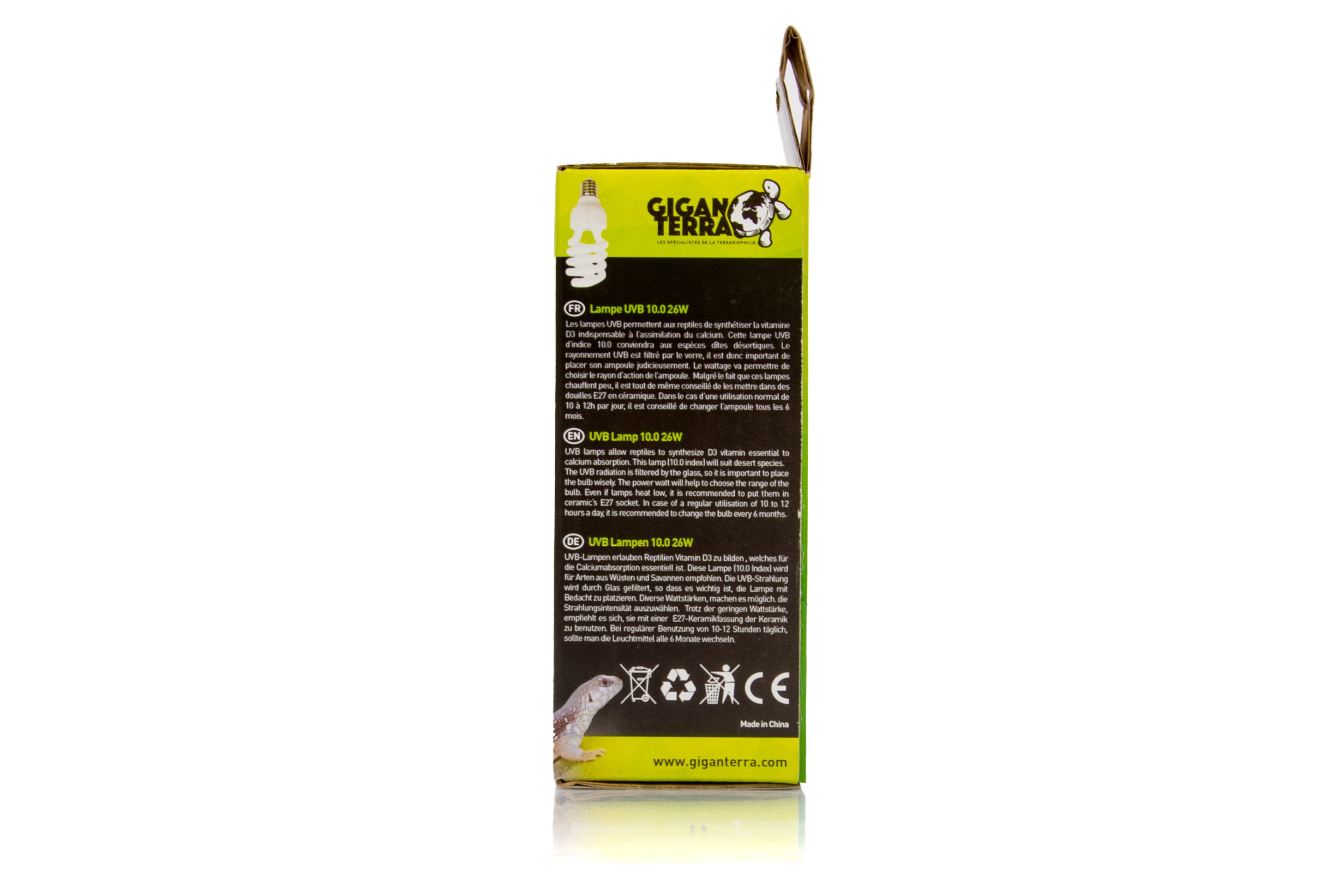 Pensée pour les reptiles issus des milieux les plus arides, la Lampe UVB GiganTerra 26W – 10.0 reproduit fidèlement l’intensité solaire caractéristique des zones désertiques. Son indice UVB 10.0 favorise la production de vitamine D3, indispensable à l’assimilation du calcium et à la santé osseuse. Grâce à sa puissance de 26 watts, elle diffuse un rayonnement étendu, idéal pour les terrariums spacieux. Installée sans vitre entre l’animal et la source, elle offre une lumière constante et bénéfique, soutenant les rythmes naturels, l’appétit et l’activité des reptiles diurnes qui dépendent de la lumière pour rester en pleine forme.