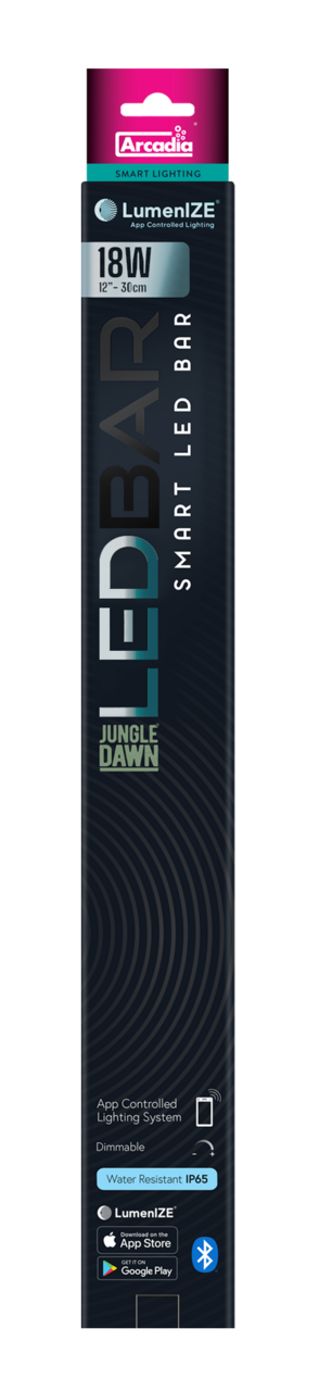 Avec sa finition noire mate et ses lignes épurées, la LumenIZE Jungle Dawn LED Bar se fond naturellement dans l’environnement du terrarium. Sa petite taille est idéale pour les habitats exigus ou les agencements multi-sources où chaque centimètre compte. Elle peut être utilisée seule ou combinée à d’autres rampes pour une couverture plus large, selon la disposition des plantes ou les zones à éclairer.