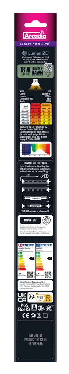 La LumenIZE Jungle Dawn LED Bar 290 mm 18 watt a été conçue pour répondre aux exigences spécifiques des terrariums tropicaux, bioactifs et plantés. Malgré son format compact, elle diffuse une lumière puissante, homogène et naturelle, capable de recréer un ensoleillement stable, essentiel au bon développement des plantes et au bien-être des reptiles, amphibiens ou invertébrés.
